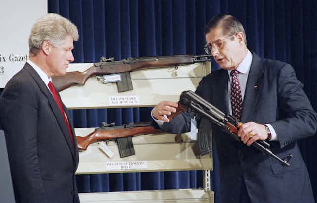 Image (top of post) credit: The Clinton-era ban on assault weapons ushered in a period of fewer mass shooting deaths. AP Photo/Dennis Cook. US President Bill Clinton looks on as Bureau of Alcohol, Firearms and Tobacco Director John Magaw holds a AK-47 submachine gun at the White House in Washington on Monday, May 2, 1994.